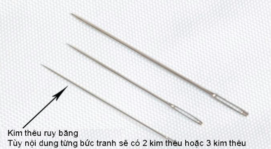 Nguyên liệu gồm : Vải in màu sẵn, chart thêu, sợi ruy băng sắc màu, chỉ thêu, kim thêu.
