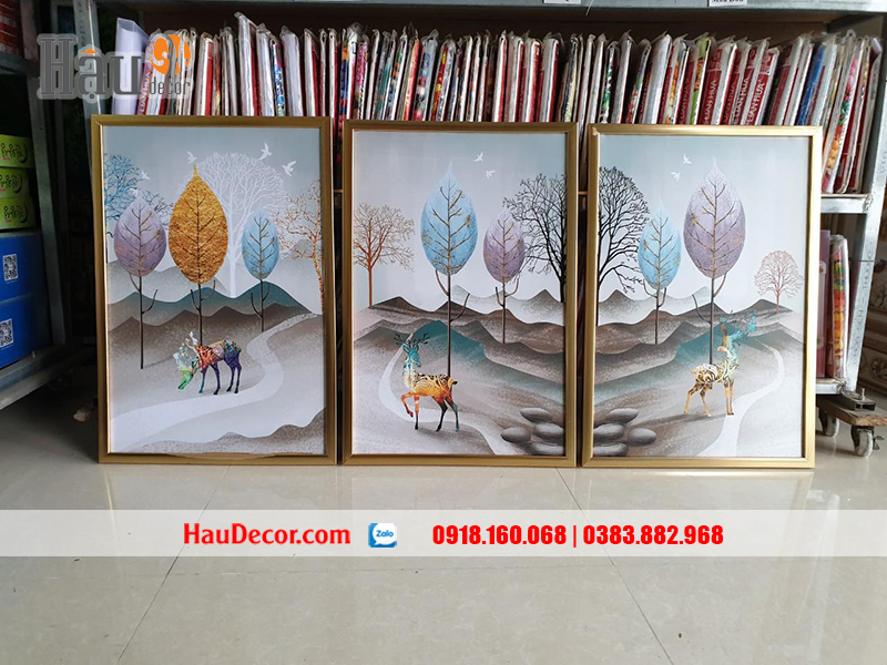 Tranh treo tường hiện đại 3D bộ 3 bức Hươu Tài Lộc 60157-a-b-c được sản xuất trên 2 chất liệu chính: